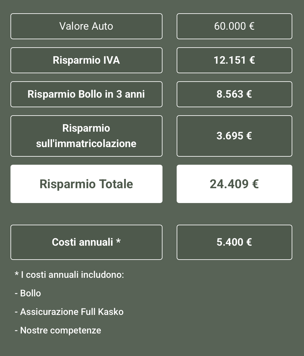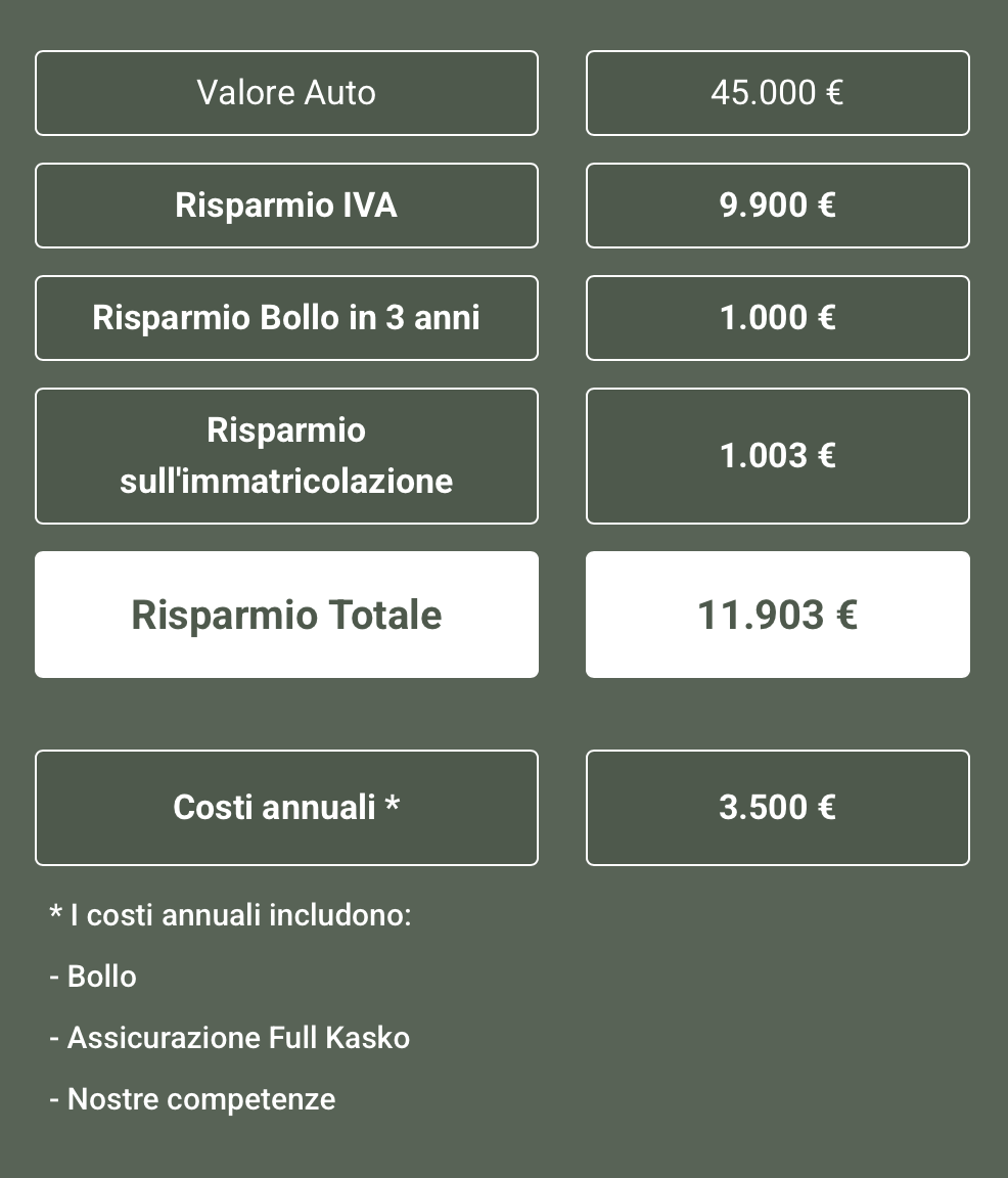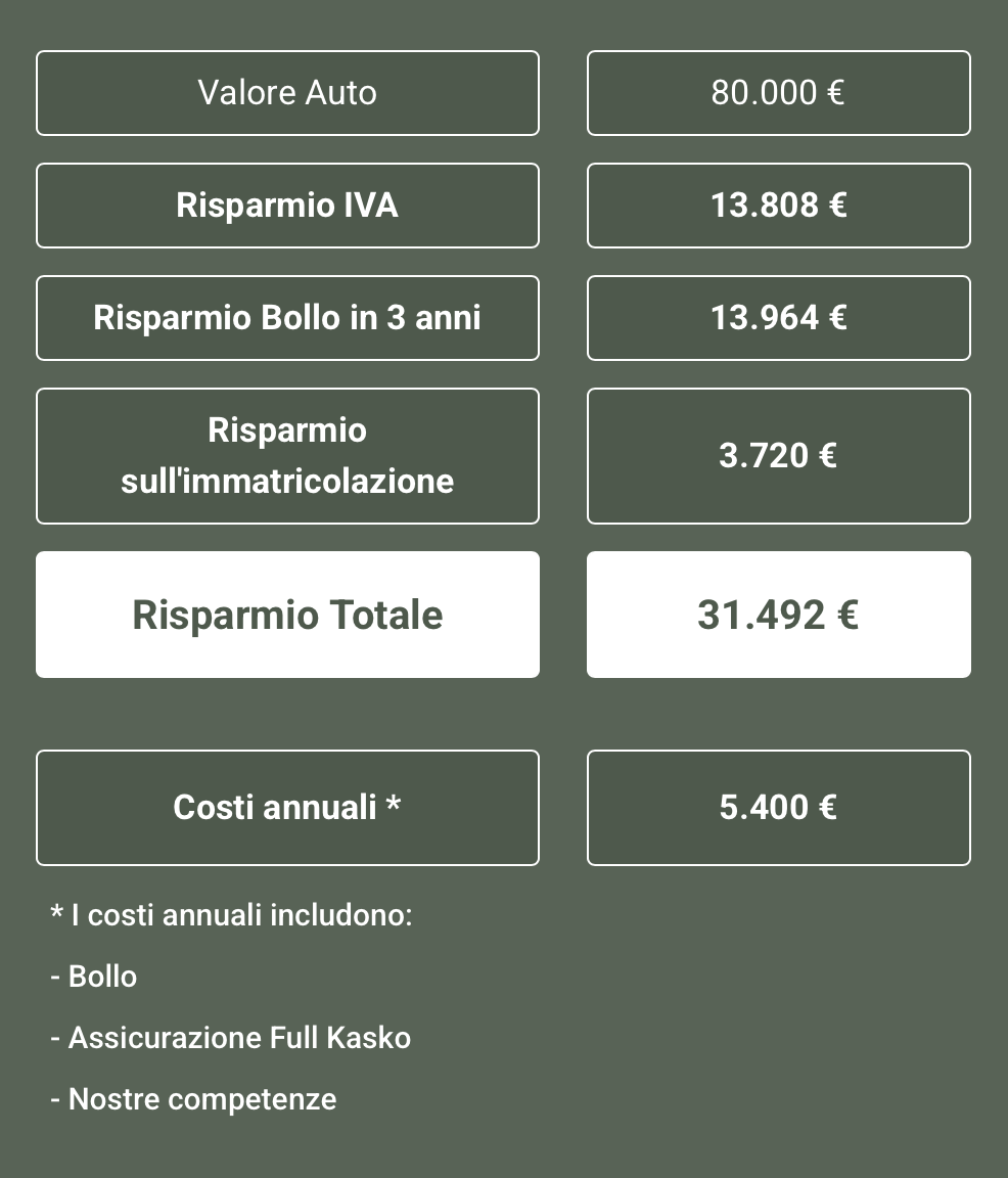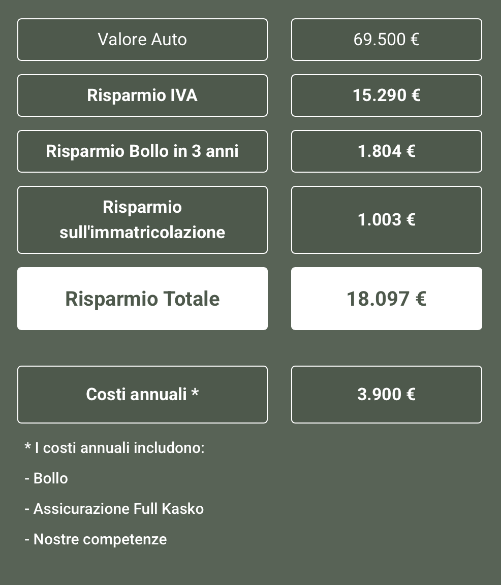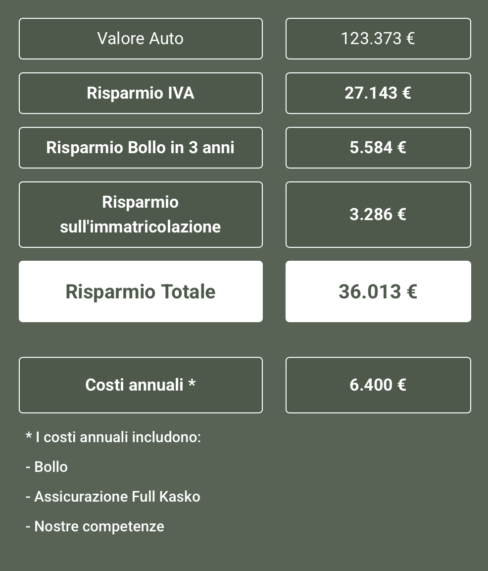 Potrai beneficiare di risparmi consistenti, diverse decine di migliaia di euro, grazie a prezzi di vendita particolarmente vantaggiosi, bollo, immatricolazione ed IVA.